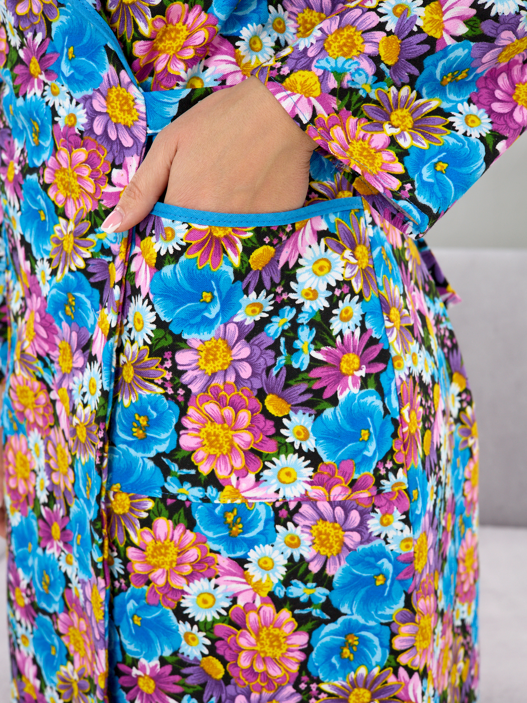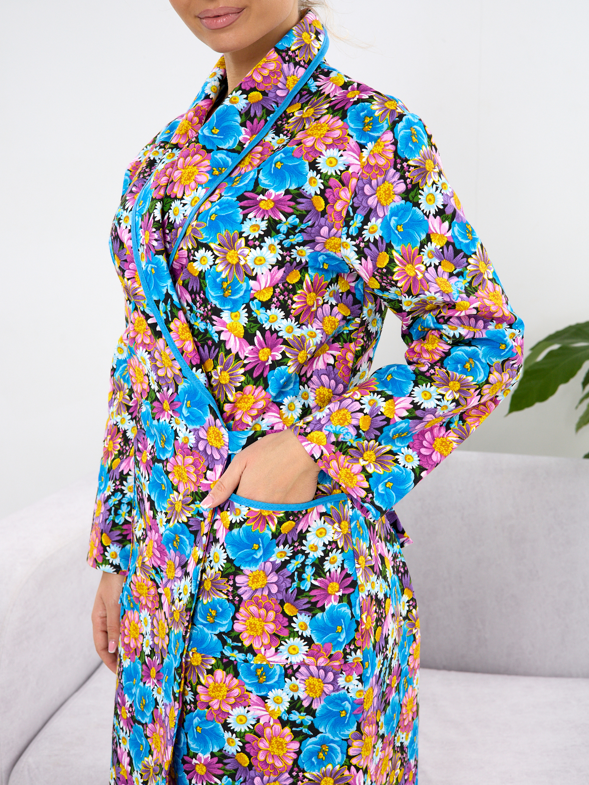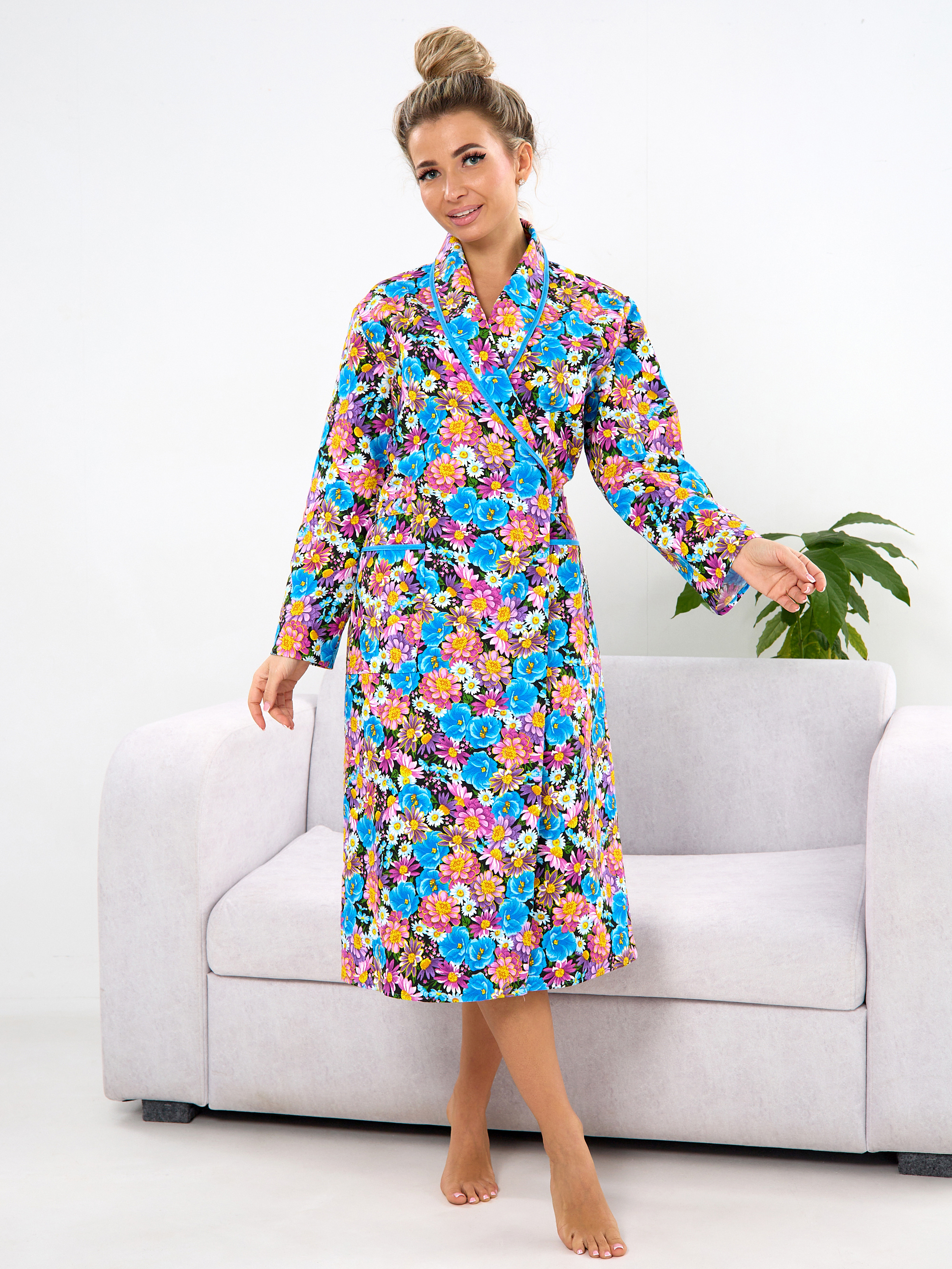 Халат байковый женский с длинным рукавом и накладными карманами на запах.