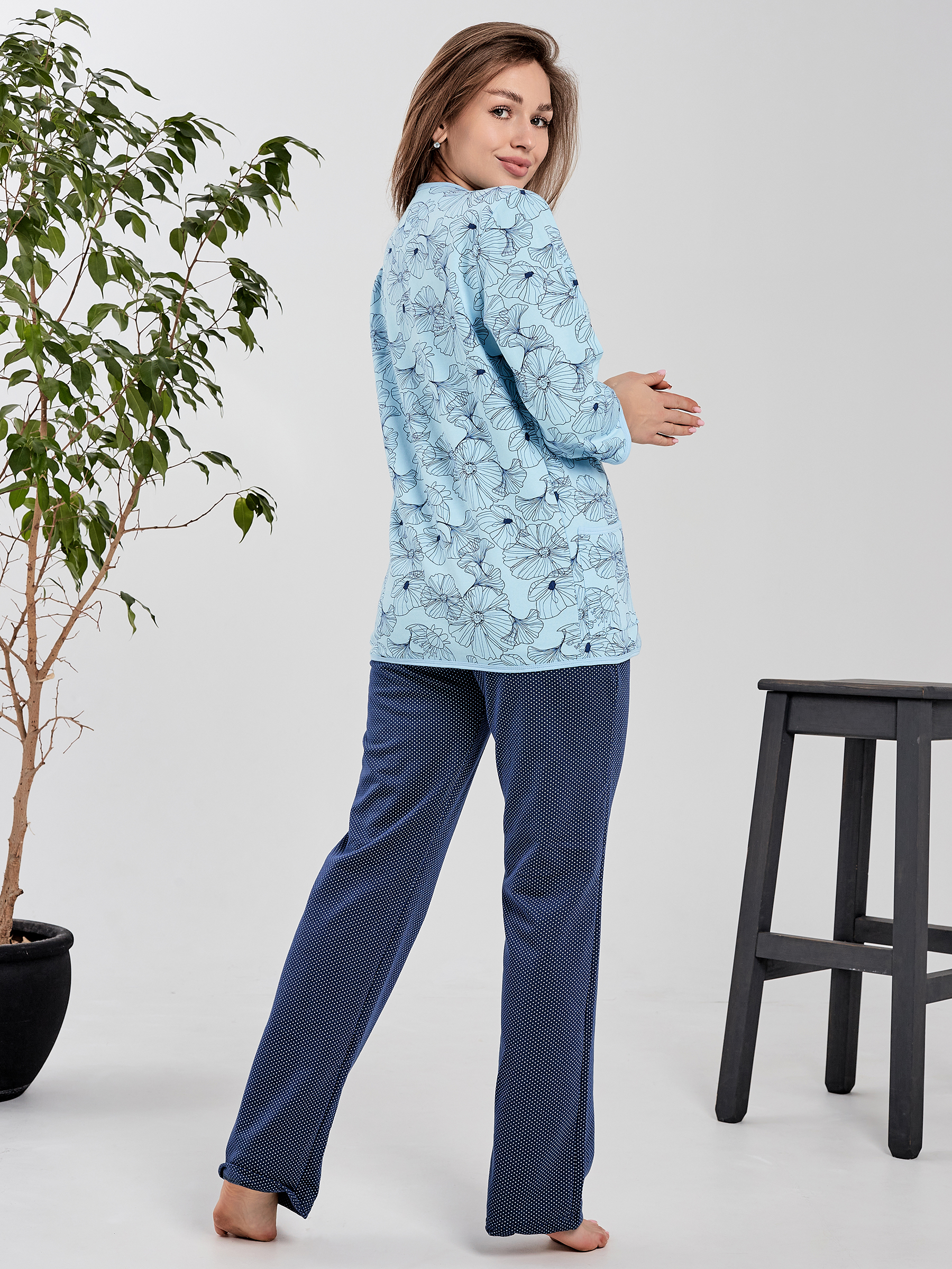 Пижама домашняя на пуговицах зимняя с брюками трикотажная удачного фасона для любых типов фигур.
