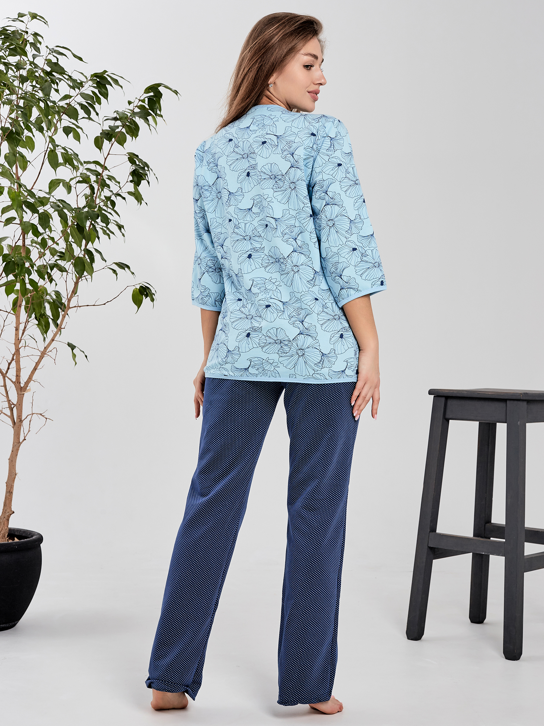 Комплект домашний женский состоит из рубашки с карманами на пуговицах и пижамных брюк на резинке.