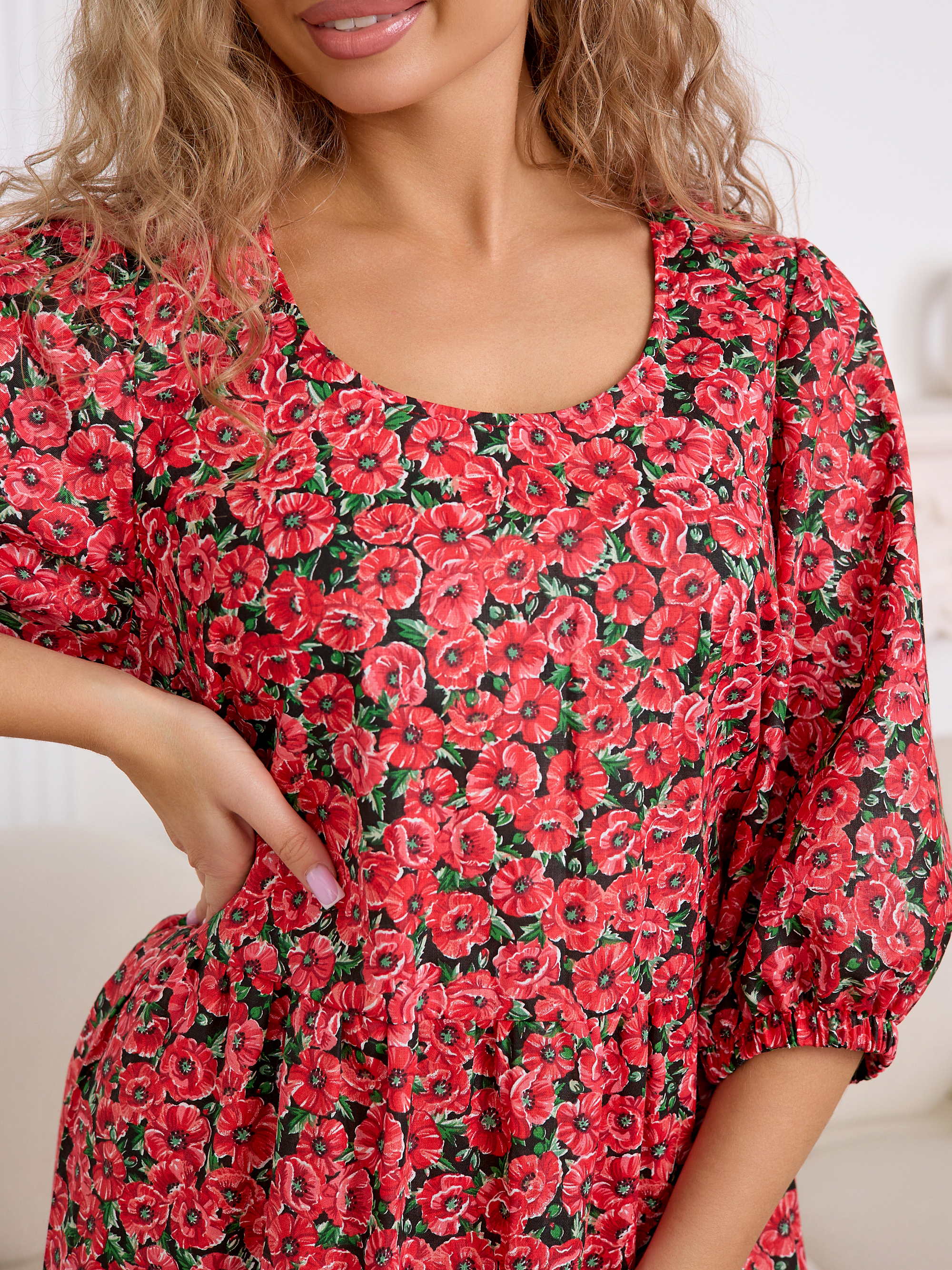 Рукав 3/4 с резинкой внизу — практичная и стильная деталь, которая завершает образ в духе «платья-крестьянки».